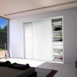ארון הזזה דגם 008 – ארון עם פתרונות אחסון בעיצוב מודרני המשלב בין דלתות צבועות לבן לדלתות בצביעת שיש.